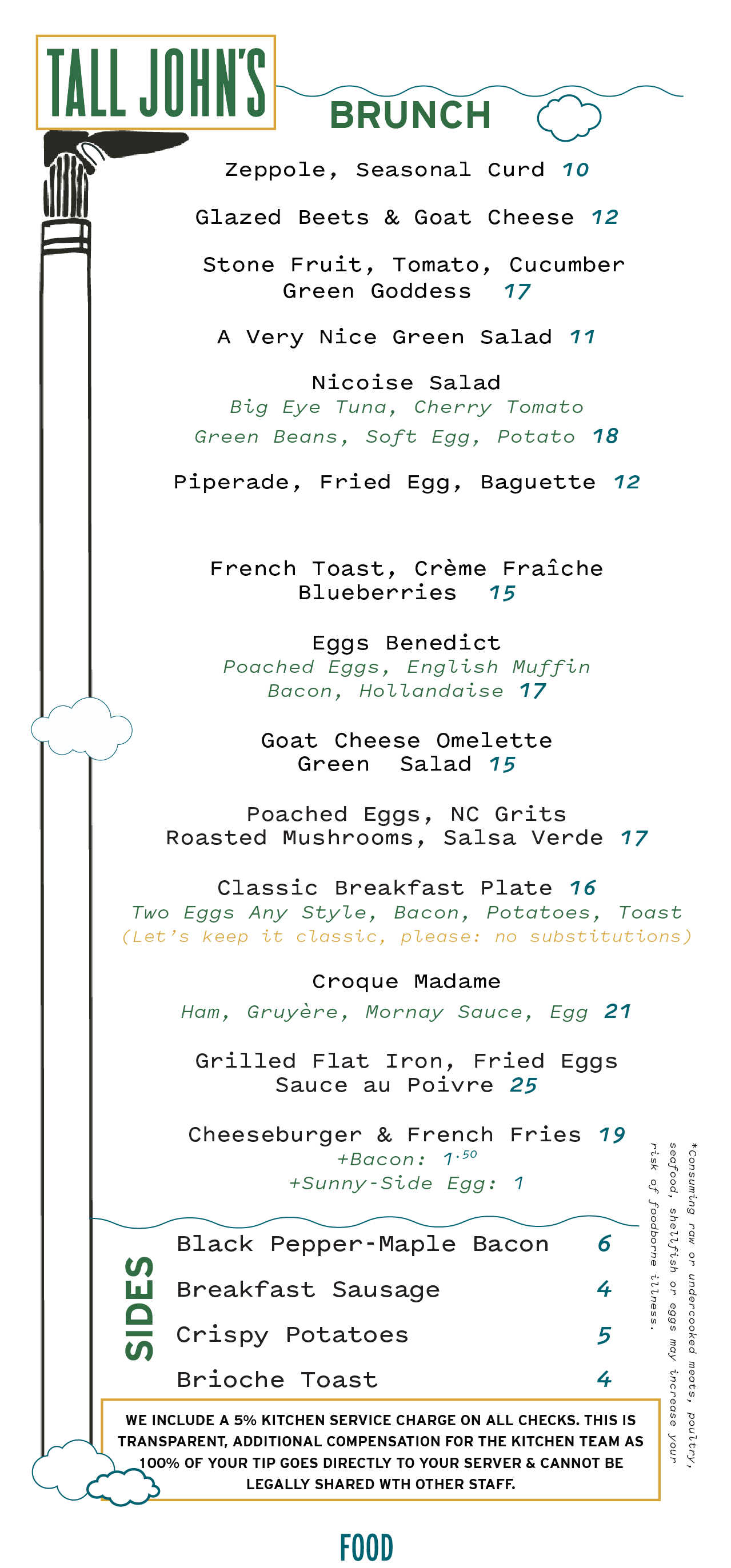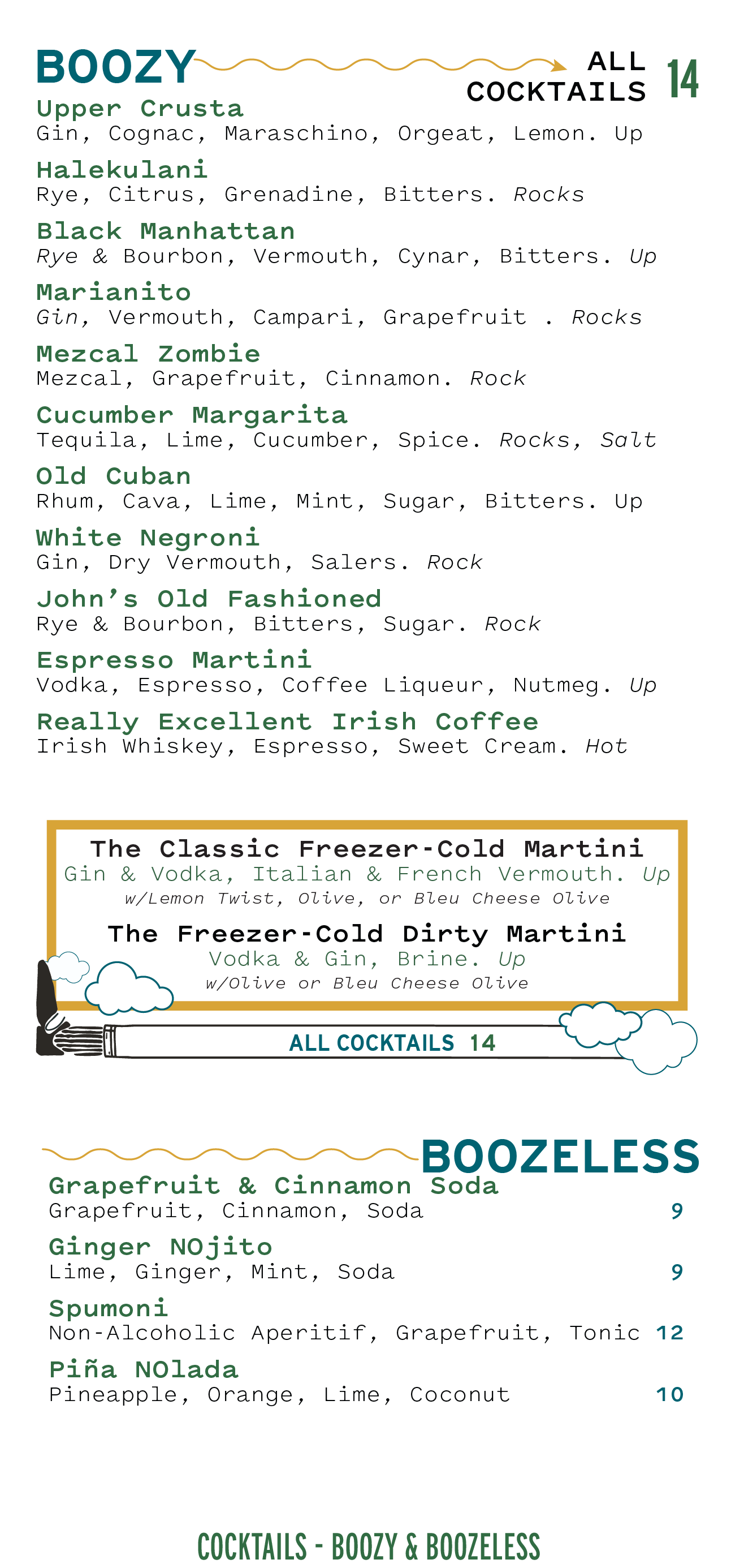 Our menus change regularly, but not on a specific schedule. We update them here as quickly as we can, so this page is fairly reliably accurate (though we make no guarantees—our kitchen and bar are driven by creativity and ingredient availability, so menus move fast, and dishes do occasionally sell out).